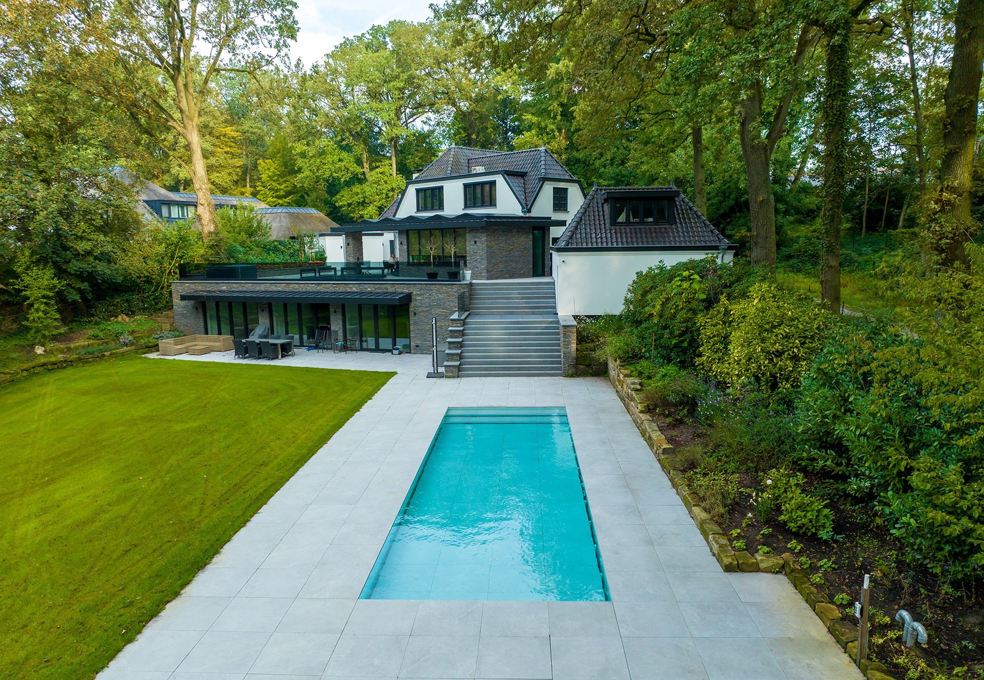 Voor wie meer beschutting wenst, kan een hogere of geïntegreerde overkapping worden gekozen. Denk aan een glazen constructie die aansluit op de woning of een poolhouse waarin binnen en buiten in elkaar overlopen.