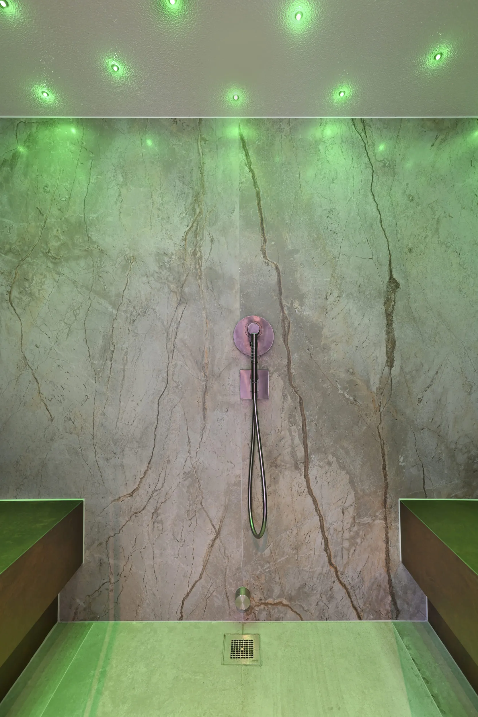 Deze complete wellness in het souterrain van het huis heeft alles in zich om je heerlijk in terug te trekken en tot ontspanning te komen. De traditionele sauna is ruim opgezet en biedt voldoende ruimte om met meerdere personen comfortabel te liggen. Bovendien kun je in de sauna desgewenst gebruikmaken van het ingebouwde infraroodpaneel. Dit zorgt ervoor dat de sauna voor meerdere doeleinden gebruikt kan worden. Naast de sauna bevindt zich een luxe stoomcabine. De sterrenhemel zorgt voor een magische sfeer, die versterkt kan worden door de geurdosering in de stoomgenerator. Beide ruimtes zijn aan de buitenzijde op dezelfde manier afgewerkt met getint glas, dat een intieme en uniforme sfeer bevordert. Het touchpanel dat dient als besturing voor de sauna en stoomruimte, is in de muur verwerkt en oogt strak. Hierin zijn alle functies opgenomen en intuïtief bedienbaar. Achter in het souterrain is, naast een loungeruimte, een whirlpool geplaatst. Deze modern ogende whirlpool is niet alleen oogstrelend, maar ook voorzien van moderne features zoals lichttherapie en bluetooth audio.